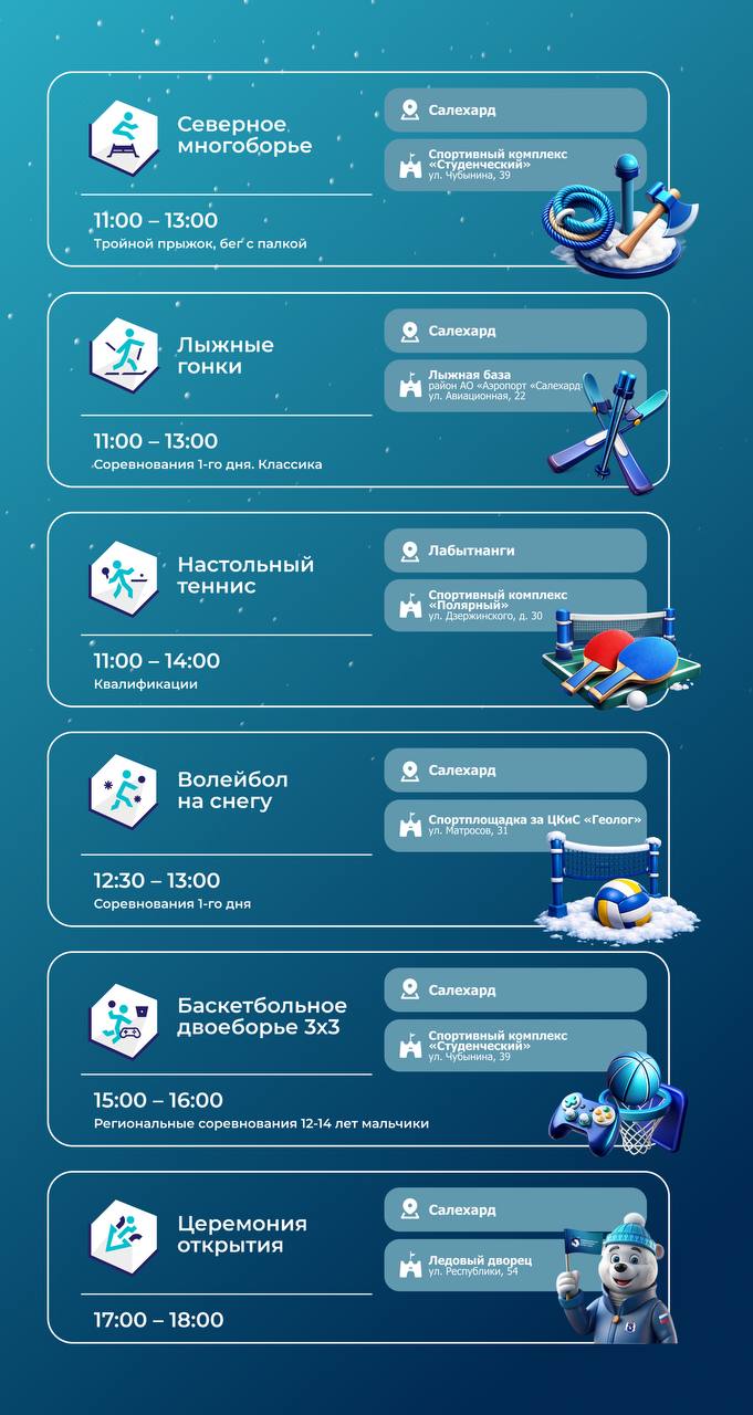 Сегодня, в первый день соревнований, в Салехарде пройдут лыжные гонки, северное многоборье, волейбол на снегу, баскетбольное двоеборье 3х3. В Лабытнанги состоятся игры по настольному теннису.